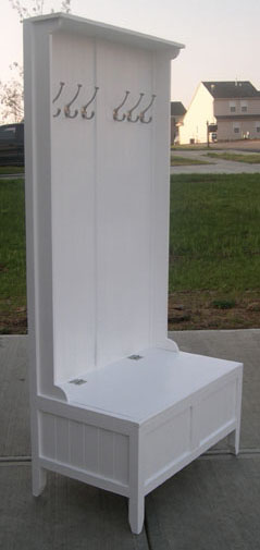 Laura’s foyer bench with coat hangers was custom made to fit in a small corner of her entryway and then painted white per her request. |