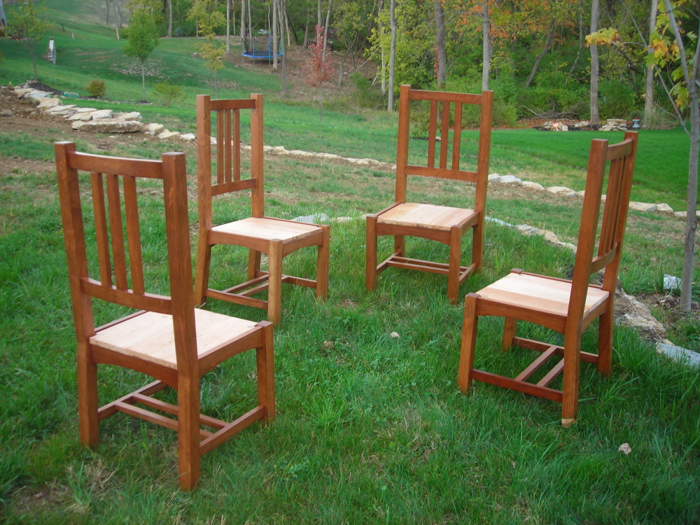 Jason’s Chairs were created using solid cherry and designed to match the dinning table that was created from him earlier this year. For now the chairs have solid cherry seats but there are plans for them to be upholstered.