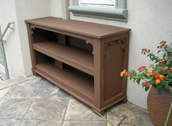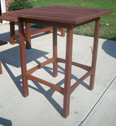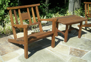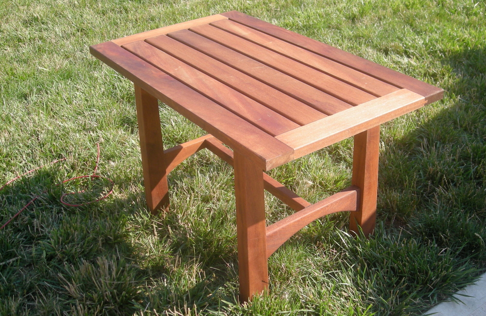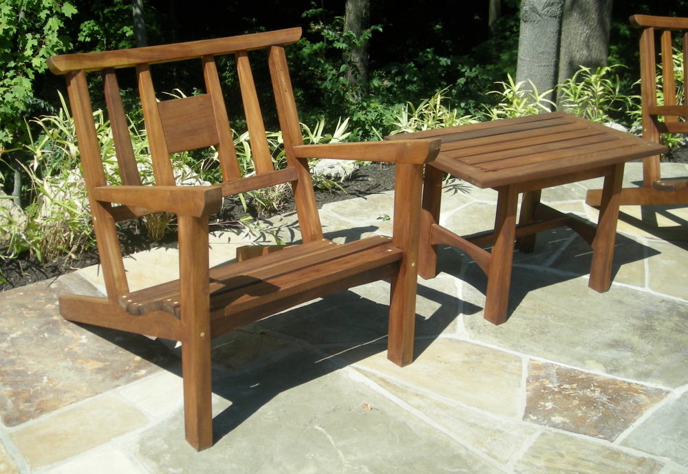 Jackie and Kirk's end table have a touch of Asian style, as did all of the Perry furniture. The slated tables not only an aesthetic choice but the slats allow rainwater to flow through.