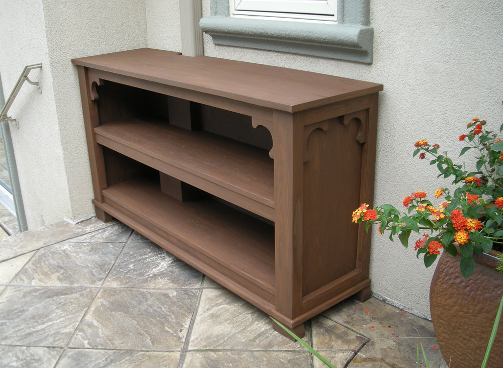 Kim’s outdoor credenza was built to fit in a specific corner of the patio by the pool. In its design and construction Broken Tree had to accommodate a sloping floor, and down spout.