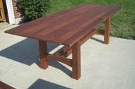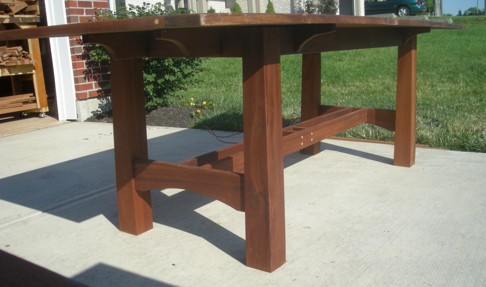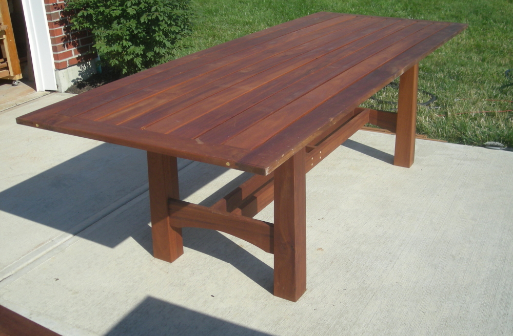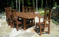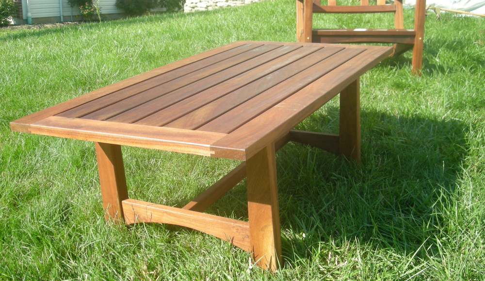 Jackie and Kirk's dinning table have a touch of Asian style, but here you can see the heavier legs the pagoda like accents and the middle pair of slats for an umbrella if they choose later. The slated tables not only an aesthetic choice but the slats allow rainwater to flow through.