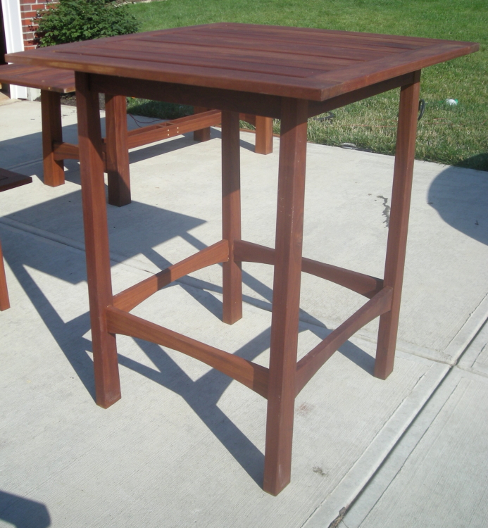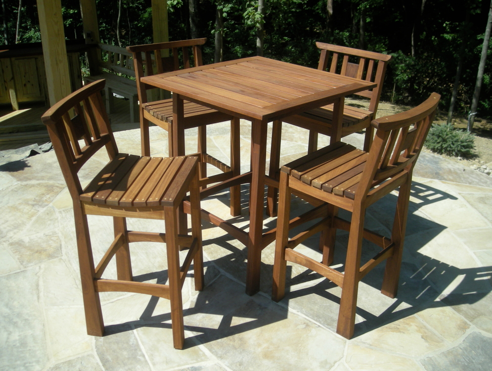 Jackie and Kirk's bar table was designed have a touch of Asian style, as did all of the Perry furniture. The slated tables not only an aesthetic choice but the slats allow rainwater to flow through.