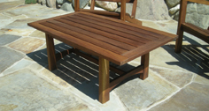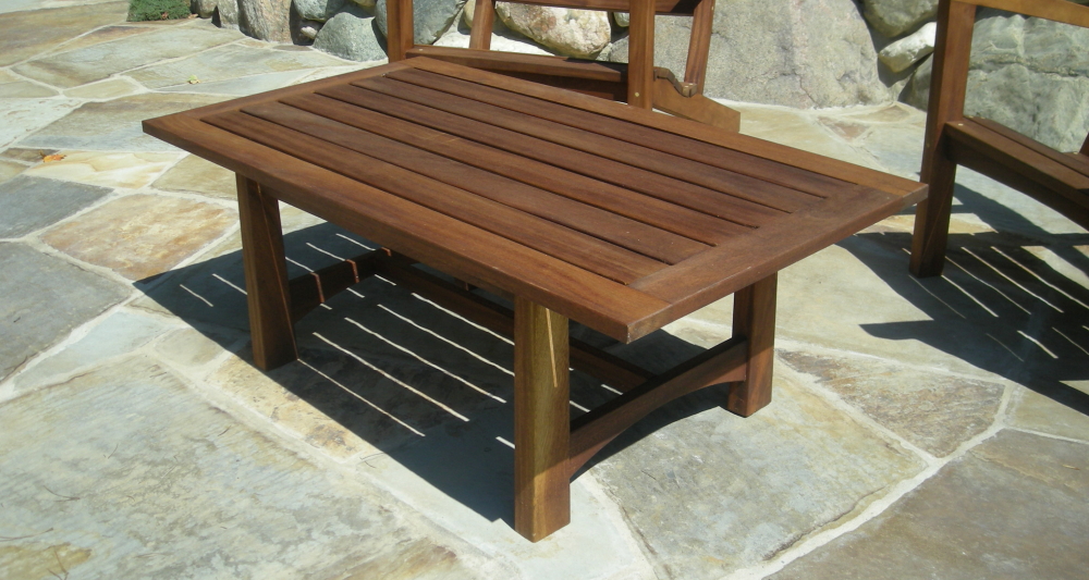 Jackie and Kirk's coffee table have a touch of Asian style, as did all of the Perry furniture. The slated tables not only an aesthetic choice but the slats allow rainwater to flow through.